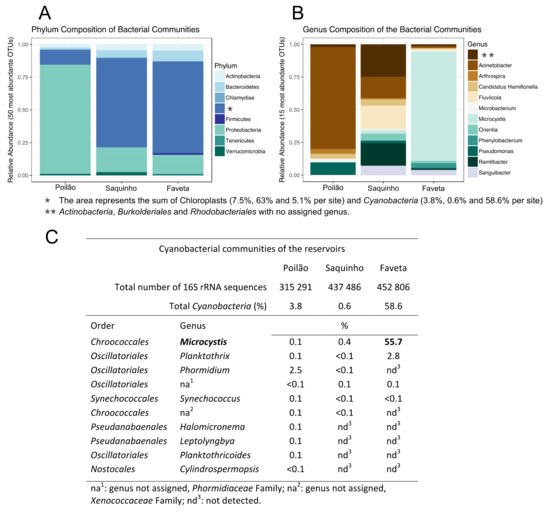 Putative toxin producers were identified in the three reservoirs. Leptospira, Vibrio, Escherichia, and Salmonella genera were detected in very low relative amounts, each representing less than 0.15% of the OTUs. The total frequency of these potentially pathogenic genera per reservoir was 0.22% in Poilão, 0.06% in Saquinho, and 0.16% of the OTUs in Faveta. We identified several cyanobacterial genera in the three sampled reservoirs. Representatives of these cyanobacteria are known from the literature to produce toxins. In Faveta reservoir, we identified the presence of cyanobacteria from the Microcystis and Planktothrix genera, reported to produce cyanotoxins, microcystin, and anatoxin-a, as well as other potentially toxic molecules like chlorinated and sulfated variants of aeruginosin, cyanopetolin, microginin, and microviridin [25,26,27]. Poilão reservoir had smaller relative quantities of cyanobacteria, but more genera were identified (Figure 1 and Figure S1), some of which were potentially toxic, such as Microcystis, Phormidium, Planktothrix, and Cylindrospermopsis. These cyanobacteria are known to produce microcystin, homo and anatoxin-a, saxitoxin, and cylindrospermopsin, as well as other metabolites with different levels of toxicity. In Saquinho reservoir, the relative quantity of cyanobacteria was the lowest (0.6%), but even so the most represented genus was the potentially toxic Microcystis.