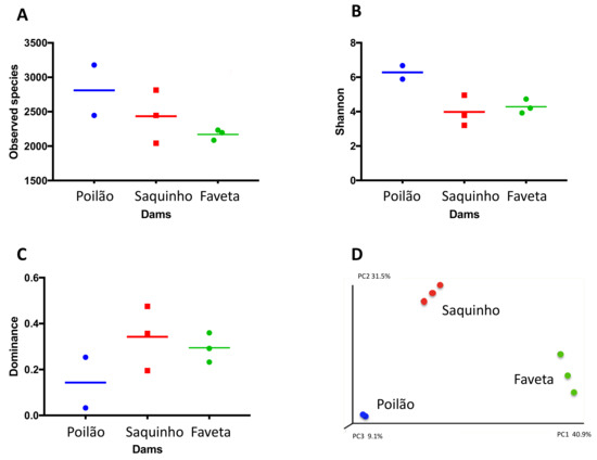 The analysis of the local diversity indices of the replicates from each reservoir revealed consistency and reinforced the sites’ distinct microbial communities (Figure 2A–C). The indices also showed that microbial communities presented different dominant genera in each of the reservoirs, as well as abundance of different taxa in all sites as typically found in freshwater bodies around the world [7,8,9,10,12].