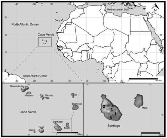 Map of Cape Verde and location of the reservoirs in Santiago Island sampled in this study. 1—Poilão, 2—Saquinho, and 3—Faveta. 4—Figueira Gorda and 5—Salineiro reservoirs where empty at the time of sampling.