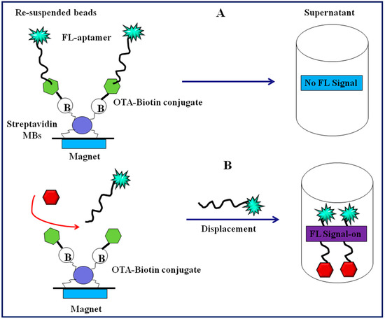 Later on, utilizing single-walled carbon nanotubes (SWCNTs) as fluorescence quencher, a fluorescent aptasensor for sensitive and selective determination of OTA was constructed by Guo et al. [61]. Compared to GOx-based sensor, the SWCNT-based aptasensor exhibited a LOD of 9.73 ng mL−1 with detection range of 10.09–80.76 ng mL−1. Similarly, Duan et al. established a new structure switchable fluorescent aptasensor for OTA detection [62]. The presented method employed the fact that when the immobilized aptamer specific to OTA binds with the target OTA it induces the conformation change in the aptamer. These conformational change results in the dissociation of the FAM-labelled complementary DNA chain from aptamer, leading to the fluorescent signal change (fluorescence on). Under optimized conditions, the method was able to detect OTA in the linear range of 0.002–10 ng mL−1 with a detection limit of 0.001 ng mL−1. The authors also validated the feasibility of method in corn samples. Later on, Chen et al. designed a simple and rapid method for OTA detection based on target induced structure switching signaling aptamer [63]. The method was based on the universal principle of target induced conformational change from aptamer/DNA duplex to target-aptamer duplex complex, which led to the release of a hybridized quencher-labelled DNA chain from the FAM-labeled OTA aptamer, generating a substantially increased fluorescence intensity. Under optimized assay conditions, the assay exhibited a wide linear detection range of 1–100 ng mL−1 with a LOD down to 0.8 ng mL−1 and an analysis time of less than 1 min. Additionally, the designed aptamer assay exhibited high selectivity and specificity, and no significant interference against structural analogues was observed. Various nanomaterials (gold, terbarium, carbon nanotubes) as fluorescence quenchers have been explored for the development of aptasensing platform to detect OTA [64,65,66]. Chen et al. developed a signal-on fluorescent aptasensor for OTA detection based on fluorescent DNA-scaffolded silver-nanocluster (AgNCs), structure-switching of anti-OTA aptamer (Ap) and magnetic beads (MBs) [67]. The feasibility of method for detecting OTA in real samples of wheat was also demonstrated. The method exhibited superior sensitivity with a detection limit as low as 0.002 ng mL−1 OTA with high specificity. Based on the dye molecule intercalates with DNA strands, Mckeague et al. designed a label free aptasensing platform for OTA detection based on intercalation of SYBR Green I. This label-free platform offered a rapid, selective, and sensitive OTA quantification with a LOD of 3.63 ng mL−1 and linear of quantification (LOQ) up to 40.38 ng mL−1 [68]. A generalized fluorescence-based aptasensing design employing carboxy- modified fluorescent (CMF) particles as a signal-generating probe and magnetic particles as a solid separation support was reported by Hayat et al. [69]. As depicted in Figure 2, as proof of concept, the proposed assay was used for OTA detection based on the displacement and competition format. The competition-based assays showed improved analytical characteristics as compared to the displacement assay. The competitive fluorescent aptamer assays exhibited high sensitivity with a detection limit and IC50 of 0.002 and 2.907 ng mL−1, respectively.