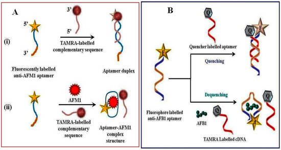 The development of structure switching assays based on fluorescence signal generation for aflatoxins detection are mainly based on the same format as those described for OTA detection. Nanomaterials are mainly employed as fluorescence quenchers. For example, our group has recently synthesized a composite of TiO2 and multiwalled carbon nanotubes to design a fluorescence quenching-based aptasensor for the detection of AFB1 [74]. An aptamer assay based on fluorescence recovery using a fluorescence quencher system composed of quantum dots and GOx was reported for detection of AFB1 [75]. To design the platform, a thiolated aptamer specific to AFB1 was linked to the surface of Q-dots via ligand exchange and the fluorescence of the aptamer modified-Q-dots was strongly quenched by GOx, which recovered on addition of AFB1. The proposed platform was evaluated both in phosphate buffer solution and in peanut oil. In peanut oil, the dynamic range was from 4.99 × 10−1–49.96 × 10−4 ng mL−1 and a detection limit of 0.44 ng mL−1 was obtained. Recently, Sharma et al. (2015) designed a structure switching signaling fluorescence aptamer assay for AFM1 detection [76]. Determination of AFM1 was based on the quenching–dequenching mechanism, where the hybridization of FAM-labelled anti-AFM1 aptamer (F-aptamer) with carboxytetramethylrhodamine (TAMRA) labelled complementary sequences (Q-aptamer) brought the fluorophore and the quencher into close proximity, resulting in maximum fluorescence quenching (Figure 3A). Under optimized experimental conditions, the developed method showed good linearity with limit of detection of 0.005 ng mL−1 for AFM1. Good recoveries were obtained in the range from 94.40% to 95.28% (n = 3) for AFM1 spiked milk sample providing no significant interference against AFB1 and OTA. Similarly, our group has constructed TAMRA quenching-based aptasensing platform for the detection of AFB1 [77], as depicted in Figure 3B. In this platform, we have compared the analytical performance of two aptamer sequences: seqA and seqB. The designed strategy exhibited good sensitivity and selectivity with a LOD of 0.2 ng mL−1 and a linear range from 0.25 to 32 ng mL−1. The aptasensor’s performance was tested in beer and wine samples and obtained recovery were in good agreement. In the same direction, two fluorescent aptasensors based on quantum dots—i.e., fluorescent nitrogen-doped carbon dots on gold nanoparticles (Wang et al.) and cysteamine-capped CdS quantum dots as a fluorescence probe (Tayebi et al.)—were designed and evaluated for detection of AFB1 and total aflatoxins, respectively [29,78].