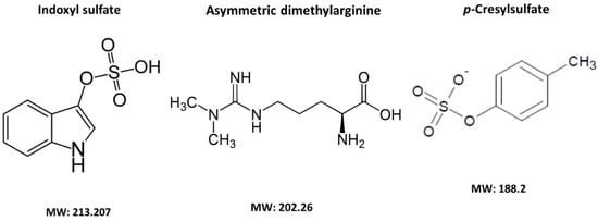 - Duranton, F.; Cohen, G.; de Smet, R.; Rodriguez, M.; Jankowski, J.; Vanholder, R.; Argiles, A.; European Uremic Toxin Work Group. Normal and pathologic concentrations of uremic toxins. J. Am. Soc. Nephrol. 2012, 23, 1258–1270. [Google Scholar] [CrossRef] [PubMed]