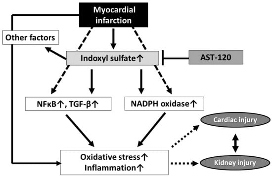 Furthermore, several detailed mechanisms of the progression of kidney disease have been proposed. For instance, IS accelerates kidney fibrosis by increasing expressions of TGF-β, TIMP-1, and pro collagen I [14]. As a direct effect of IS on kidney cells, IS is taken up by kidney tubular cells via organic anion transporter-1 (OAT-1) and organic anion transporter-3 (OAT-3), and various accumulative effects are exerted in the kidney. IS accumulation in tubular cells destroys the anti-oxidative system, which leads to cellular dysfunction and increased oxidative stress [15]. Moreover, increased PAI-1 expression by activating NF-κB induces dysfunction of kidney tubular cells [16]. Increased expressions of TGF-β, MCP-1, and ICAM-1 also contribute to the progression of kidney damage [17]. Although a decrease in klotho expression is reportedly associated with kidney fibrosis, IS reduces klotho expression in the kidney [18]. IS induces both local and systemic oxidative stress, which leads to systemic organ damage [19]. In fact, lowering serum IS levels by the administration of AST-120 reduces oxidative stress, thereby ameliorating kidney injury [20,21]. Furthermore, recent experimental studies have found that serum IS levels were elevated after myocardial infarction with no decrease in kidney function, while kidney injury markers and oxidative stress were increased in the serum and kidney [22,23]. Treatment with AST-120 decreased the expression of these markers and oxidative stress. Overall, these findings suggest that IS is associated with the pathophysiology of cardiorenal syndrome and that AST-120 could improve these abnormalities (Figure 2).