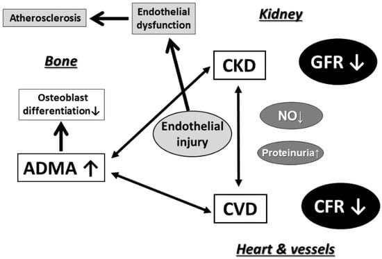 Chronic ischemia and hypoxia in the tubulointerstitium by ADMA, leads to tubulointerstitial fibrosis and peritubular capillary loss, which are important pathophysiological changes in the progression of CKD. Elevation of plasma ADMA levels increases apoptosis and inhibits proliferation and migration of endothelial cells by decreasing NO production [42,43,44]. Furthermore, oxidative stress is a major contributor to the progression of CKD and CVD. ADMA increases oxidative stress and affects endothelial NO synthase coupling and NO bioavailability [45].