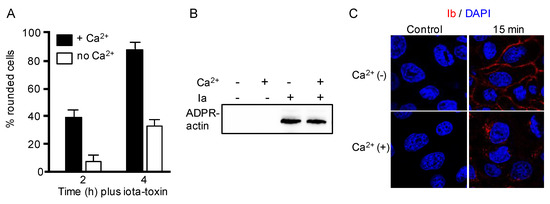 Role of Ca2+ on action of iota-toxin. (A) Madin–Darby canine kidney (MDCK) cells were treated either in Ca2+ (1.8 mM) media or Ca2+-free media with Ia (200 ng/mL) and Ib (400 ng/mL) at 37 °C for the indicated incubation periods. Photographs of the cells were taken. The number of rounded cells and total number of cells were counted from the photographs, and the number of round cells was indicated as a percentage of the values for the untreated control (means ± standard deviation (SD) (n = 3)); (B) Detection of ADP-ribosylated actin (ADPR-actin). Ia was incubated with biotin-labeled NAD+ and beta-actin in the presence or absence of Ca2+ (1.8 mM) buffer at 37 °C for 60 min. Biotin-ADP-ribosylated actin was analyzed by western blotting. Representative data from one of three studies are shown; (C) MDCK cells were treated with Ib (1 μg/mL) at 37 °C for 15 min. Cells were fixed, permeabilized, and stained with an anti-Ib antibody and 4′,6′-diamino-2-phenylindole (DAPI). Ib (red) and the nucleus (blue) were viewed using a confocal microscope. The same studies were performed four times, and a typical result is shown. Bar, 7.5 μm.