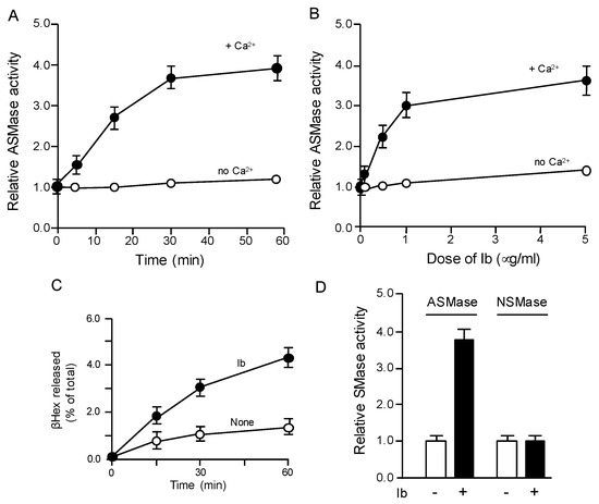 Ca2+-triggered exocytosis of the lysosomal enzyme ASMase promotes endocytosis of lesions [19,20,21]. As depicted in Figure 2A,B, Ib elevates ASMase activity in the extracellular medium in a concentration- and time-dependent fashion in Ca2+ medium, but not in Ca2+-free medium. The origin of ASMase in the extracellular medium is proposed to be lysosomal exocytosis. To examine whether Ib causes the exocytosis of lysosomes, the extracellular medium from the cells treated with Ib was evaluated for the presence of β-hexosaminidase (βHex) as a lysosomal marker protein [22] (Figure 2C). βHex activity was time-dependently elevated in the extracellular medium from the Ib-incubated cells compared to the control cells. This result indicated that Ib facilitates lysosomal exocytosis. We next examined whether Ib induces the activation of neutral sphingomyelinase (NSMase) (Figure 2D). The extracellular medium from Ib-treated cells exhibited increased ASMase activity. In contrast, Ib did not induce an increase in NSMase activity.