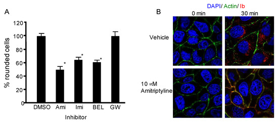 Inhibition of acid sphingomyelinase blocks iota-toxin-caused cytotoxic activity. (A) MDCK cells were preincubated with various inhibitors (25 μM) at 37 °C for 1 h. The cells were treated with Ia (200 ng/mL) and Ib (400 ng/mL) at 37 °C for 4 h. The number of rounded cells and total number of cells were counted from the photographs, and the number of round cells is shown as a percentage of the values for the untreated control (means ± standard deviation (SD) (n = 4)). Significant differences (Student’s t-test) from control cells are shown. * p < 0.01, significantly different from DMSO plus iota-toxin. Abbreviations: DMSO, dimethyl sulfoxide; Ami, amitriptyline; Imi, imipramine; BEL, bromoenol lactone; (B) MDCK cells were preincubated with amitriptyline (10 μM) at 37 °C for 1 h. Cells were incubated with Ib (1 μg/mL) at 37 °C for 30 min. Cells were fixed, permeabilized, and stained with the anti-Ib antibody, Alexa Fluor488-phallodin and DAPI. Ib (red), actin (green), and the nucleus (blue) were analyzed using a confocal microscope. A representative data from one of three studies is shown. Bar, 7.5 μm.