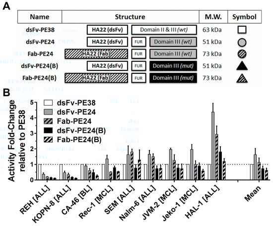 Therapeutic antibodies have become the standard of care in the treatment of a variety of diseases, including cancer [1]. Therapeutic antibodies enable a specific attack against target cells, while the unrelated tissue remains unaffected. To further increase the efficacy of therapeutic antibodies, the constant fragment (Fc) of antibodies has been engineered to improve recruitment of complement and immune cells [2] and antibodies were armed with radionucleotides [3], chemotherapeutic drug conjugates [4,5], or plant and bacterial toxins [6]. The latter, also called immunotoxins, show high clinical activity against hematologic malignancies [6,7]. The immunotoxin Moxetumomab pasudotox consists of a CD22-targeting disulfide-stabilized antibody fragment (dsFv) and a 38 kDa fragment of Pseudomonas exotoxin (PE). Moxetumomab pasudotox (hereafter referred to as dsFv-PE38) produces response rates of 86% in patients with relapsed/refractory (r/r) hairy cell leukemia [8], and of 32% in r/r pediatric acute lymphoblastic leukemia (ALL) [9].