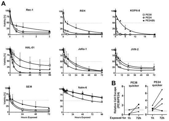 Previously, we found that cells have to be exposed to CD22-targeted immunotoxins for a highly variable time for them to die [15]. Accordingly, we tested the time cells that had to be exposed to the five immunotoxins to induce cell death. We chose an equimolar concentration of 2.8 nmol/L immunotoxin, because it correlates with the amount of Fab-PE24(B) that reaches KOPN-8 cells growing in the murine BM after an intravenous single dose [15]. After treating with 2.8 nmol/L, the cells were washed at indicated times, replated in fresh medium, and three days after start of the assay, enough time for a cell that was exposed to a lethal dose of immunotoxin to die, cell viability was determined. The time that is needed to reach more than 50% cell death varied widely from less than 30 min to more than four days (Figure 2A, Supplementary Table S2). For the Reh and the KOPN-8 cells, the PE38-variant needed much less exposure time than the PE24 or the PE24(B) variants to induce cell death. All of the other cell lines were killed after shorter exposure time to the WT PE24 than to the mutated PE24(B) or the domain II-containing PE38. This was most pronounced for HAL-01, where the PE24-variant induced more than 50% cell death after 6 h, the PE24(B) after 9 h, and the PE38 after 24 h, suggesting that full domain II increased the exposure time needed to kill HAL-01 cells by 4-fold. Cells consistently had to be exposed longer to the PE24(B) variants than to WT PE24 to induce cell death. As suggested by the slightly higher activity in WST-8 assays, the dsFv-immunotoxins always needed shorter exposure time than their respective Fab variant to reach similar cell killing (Supplementary Figures S1 and S2). Whether an immunotoxin variant was more cytotoxic than any other variant after 1 h of exposure did not predict whether it remained as the most active variant after 72 h of exposure. To enable a comparison, we mathematically generated the relative cell escape as the ratio of living cells after treatment with two distinct immunotoxins. Comparing relative cell escape showed that, even though being slower initially, treatment with Fab-PE24 was more potent than dsFv-PE38 at later time points against most cell lines (Figure 2B). Cell lines, which showed less cell escape after 1 h of treatment with Fab-PE24 than after dsFv-PE38, consistently showed less escaping cells when being treated with Fab-PE24 for 72 h. On the other hand, two of three cell lines showing less relative cell escape after 1 h of treatment with dsFv-PE38 than with Fab-PE24 showed less escaping cells after 72 h of exposure to Fab-PE24 than to dsFv-PE38.