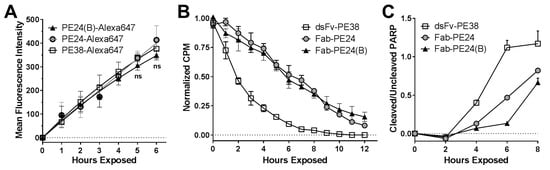 To test whether biochemical events reflected their distinct activity in vitro, we analyzed the critical steps of the immunotoxin intoxication processes. First, we compared the rate of internalization using Alexa647-conjugated immunotoxins (Figure 4A). For the three variants, the mean fluorescence intensity (MFI) of Alexa647 increased almost linearly over 6 h, and there was no significant difference between the MFIs of any of the immunotoxins. We next determined the rate of protein synthesis over time of immunotoxin treated cells (Figure 4B). Correlating with the shorter needed exposure time to kill efficiently, the dsFv-PE38 reduced protein synthesis in an exponential manner, and much faster than PE24 and PE24(B), which reduced protein synthesis in a linear manner. The rate of arresting protein synthesis was not different for PE24 and PE24(B). Thus, the advantage of the domain II containing immunotoxin against KOPN-8 occurred after internalization, but before the arrest of protein synthesis. Additionally, the time to reach the late-apoptotic PARP-cleavage was determined (Figure 4C). Six hours after the treatment started, the ratio of cleaved over uncleaved PARP was 1.12 for dsFv-PE38, 0.48 for Fab-PE24, and 0.13 for Fab-PE24(B). The time that is needed to induce the late-apoptotic event of PARP-cleavage in KOPN-8 cells was the shortest after treatment with dsFv-PE38, longer after Fab-PE24, and the longest after Fab-PE24(B), thereby also confirming differences in the efficacy of inducing cell death biochemically.