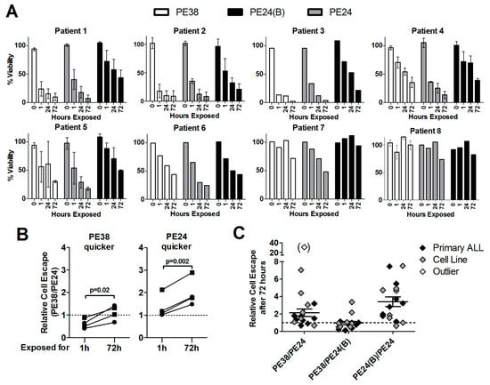 Patient-derived primary ALL cells are on average most sensitive to the PE24-variant. (A) Primary patient derived B-ALL cells were co-cultured on murine OP-9 stromal cells and treated with 2.8 nmol/L immunotoxin for the indicated times, washed, and replated on the same feeder layer. Three days after assay initiation, cell viability of the human ALL cells was determined by flow cytometry. Bars indicate the mean % of living cells at each time point, errors shown as SEM; and, (B) The relative % of cell killing was normalized as cell killing by PE24/cell killing by PE38 after 1 h and after 72 h of drug exposure. All of the cell lines were divided into two groups, one where PE24 was less active after only 1 h (PE38 quicker) and one where PE24 was more active after 1 h (PE24 quicker). Results of the same cell line after 1 h and after 72 h of exposure are connected by a line, p-values determined by paired t-tests; and, (C) Results from cell lines (grey rhombs) and patient cells (black rhombs) were pooled and the relative cell escape at 72 h of continuous exposure mathematically determined by dividing the fraction of living cells after the indicated treatment. The mean relative cell escape is indicated by a black line, error as SEM, clear rhomb in brackets was defined as outlier and was excluded from the mean relative escape.