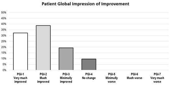 The clinical benefits perceived by the patients were assessed using the Patient Global Impression of Improvement (PGI-I) scale (Table 3).
