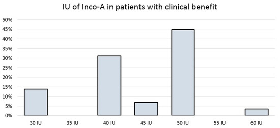 Among the 29 responders, most patients (24, 82.8%) required between 40 IU and 50 IU, while four patients (14.3%) required 30 IU or less, and one patient required the maximum dose of 60 IU because of the incomplete effect of inco-A at lower doses (Figure 4).