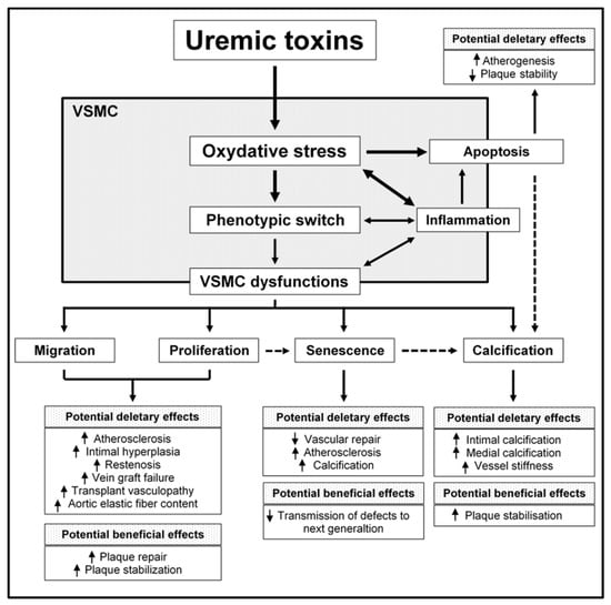 Senescence is a protective mechanism engaged in response to excessive cellular stress. It induces a permanent cell cycle arrest, and prevents the transmission of defects to the next generation. Senescence can occur after repeated cell division or can be induced by a variety of stresses, including mitochondrial deterioration, DNA damage and oxidative stress—all processes to which VSMCs are exposed within the uremic milieu. It is now acknowledged that VSMC senescence impairs vascular repair and is accompanied by fibroblast invasion, vascular calcification, and the development of atherosclerosis []. Senescent VSMCs are large, flattened and star-shaped. They have short telomeres, accumulate prelamin A, and contain elevated levels of senescence-associated markers (including senescence-associated β-galactosidase (SAβG) and cell cycle regulators (such as p16, p21, p53, and pRb) []. Senescent cells are known to have a specific, senescence-associated secretory phenotype (SASP) that affects the surrounding tissue and alters local homeostasis. In an elegant study, Gardner and colleagues observed that senescent VSMCs secrete many cytokines (including IL-6 and -8) in an IL-1α-dependent manner []. In the latter study, SAPS VSMCs secreted abnormally high levels of MMP9, downregulated collagen, and upregulated inflammasome components. Secretion of IL-1α by senescent human VSMCs was found to drive the SASP in an autocrine manner []. Interestingly, SAPS VSMCs primed adjacent control VSMCs to adopt a proinflammatory state, and promoted the chemotaxis of mononuclear cells both in vitro and in vivo—suggesting that VSMCs may actively contribute to the chronic inflammation associated with atherosclerosis []. Taken as a whole, these data highlight the existence of a vicious circle through which VSMC dysfunction accentuates VSMC dysfunction. In accordance with these observations, unstable, mature plaques show clear evidence of VSMC senescence [,], and restenosed neointimas also contain senescent VSMCs []. It is noteworthy that vascular tissues from CKD animals contain elevated levels of SaβG [,], suggesting that uremia promotes CVD by increasing VSMC senescence.