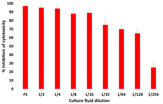 Lkt neutralizing activity of mAb AM113. Serial dilutions of mAb AM113 in the form of culture fluid were incubated with B. trehalosi Lkt dilution that gives 50% cytotoxicity. Following incubation, the target cells were added to the Lkt-mAb mixture and the cytotoxicity assay was completed. Culture fluid containing the mAb AM113 exhibited a neutralizing antibody titer of 1:128. Error bars indicate standard deviations of the means.