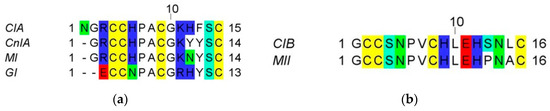 Sequences of α-conotoxins. (a) Alignment of CIA α-conotoxin with other closely related 3/5 α-conotoxins; (b) Alignment of 4/7 α-conotoxin CIB with MII.