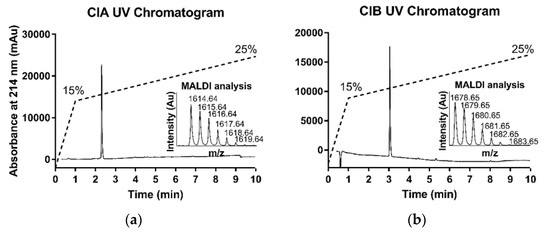 HPLC and MS analyses of synthetic CIA and CIB. (a) Synthetic folded CIA UV chromatogram at 214 nm and mass spectrometry MALDI analysis; (b) Synthetic folded CIB UV chromatogram at 214 nm and mass spectrometry MALDI analysis. Dashed line indicates the acetonitrile gradient.