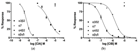 Concentration-response analysis of α-conotoxins CIA (a) and CIB (b) on wild type nAChRs. The indicated subunit combinations were expressed in Xenopus laevis oocytes and analyzed by 2-electrode voltage clamp at -70 mV. Responses to 2-s pulses of 100 µM ACh (or nicotine in case of the α7 receptor) were recorded after a 3-min preincubation with the indicated toxin. Each point represents the mean of measurements from at least 3 different oocytes. Error bars represent S.E.M.