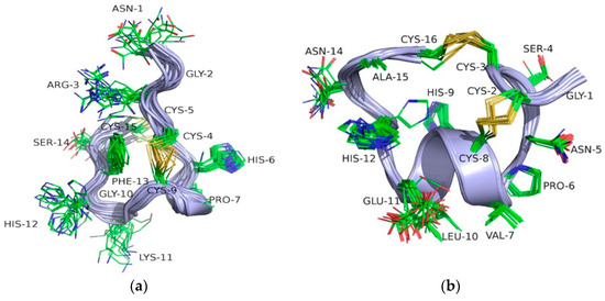 - Gouda, H.; Yamazaki, K.; Hasegawa, J.; Kobayashi, Y.; Nishiuchi, Y.; Sakakibara, S.; Hirono, S. Solution structure of alpha-conotoxin MI determined by 1H-NMR spectroscopy and molecular dynamics simulation with the explicit solvent water. Biochim. Biophys. Acta 1997, 1343, 327–334. [Google Scholar] [CrossRef]