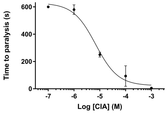 Since both CIA and CIB were detected in the predatory venom of the piscivorous C. catus, they were injected into fish (Danio rerio) in order to infer the possible ecological role of each conotoxin in prey capture. Intramuscular injection of α-conotoxin CIA produces a rapid flaccid paralysis of skeletal muscles, as evidenced by a loss of equilibrium of the fish, and ultimately a complete immobilization. Paralysis induced by conotoxin α-CIA was a dose-dependent effect, with an IC50 of 6.88 μM (Figure 6). Based on the calculated average weight of our adult zebrafish (0.5 g) and the volume injected (5 μL), CIA has an ED50 of 110 μg/kg. Injection of up to 1 mM of CIB, however, does not produce any noticeable effect on the locomotion of zebrafish, which is consistent with the absence of activity on muscle nAChR.