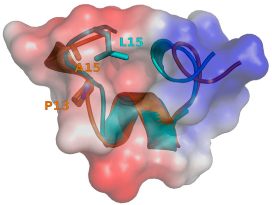 Charge distribution of CIB (orange) and MII (blue; PDB: 1MII), superimposed over residues 1 to 16. Charges are represented with different shades from red (negative charge states) to blue (positive charge states). A cavity appears in the molecular surface of CIB, which is partially filled by L15 in MII.