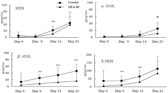 Results for the analysis of urinary concentrations of ZEN, α-ZOL, β-ZOL, and total ZEN (ΣZEN; ZEN + α-ZOL + β-ZOL) during the experimental period, with and without DFA III supplementation, are shown in Figure 1.