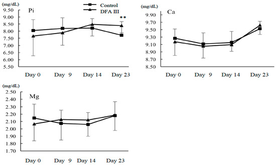 Results for the concentration of serum Pi, Ca, and Mg during the experimental period with (DFA III group) and without DFA III supplementation (control group). ** Significant difference (p < 0.05) between DFA III group and control group.