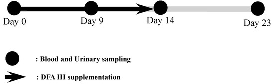 Experimental protocol for DFA III supplementation in dietary feed and sampling of blood and urine.