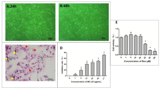 MC-LR (purity > 96%) was purchased from Beijing Express Technology Co. (Beijing, China). An institutional safety procedure was used to carry out the experiment according to the textbook of the “Experimental methods and techniques of toxicology”. Dulbecco’s modified eagle medium/nutrient mixture F-12 (DMEM/F-12), fetal bovine serum (FBS), penicillin–streptomycin, 0.25% trypsin, and collagenase type I were purchased from GIBCO (Rockville, MD, USA). RES was purchased from Abcam (Cambridge, UK). The annexin V–FITC/PI apoptosis detection kit and mitochondrial membrane potential assay kit were purchased from Beyotime Institute of Biotechnology (Shanghai, China). Cell Counting Kit-8 (CCK8) was purchased from Dojindo Laboratories (Kyushu Island, Japan).