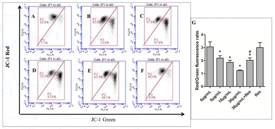 Effects of RES and MC-LR on the mitochondrial membrane potential in Sertoli–germ cells. The mitochondrial membrane potential of cells was detected by JC-1 staining and flow cytometry: (A) 0 μg/mL; (B) 9 μg/mL; (C) 18 μg/mL; (D) 36 μg/mL; (E) 36 µg/mL + RES; and (F) RES. (G) Quantitative analysis of green/red fluorescence in Sertoli–germ cells. Data are expressed as mean ± SEM (n = 3); * p < 0.05 vs. the control group, # p < 0.05 vs. the MC-LR group (36 μg/mL). Red/Green fluorescence ratio was calculated via mean red fluorescence value (mean FL2-H value) and mean green fluorescence value (mean FL1-H value) which were given by flow cytometer. P2: red fluorescent cells; P3: green fluorescent cells.