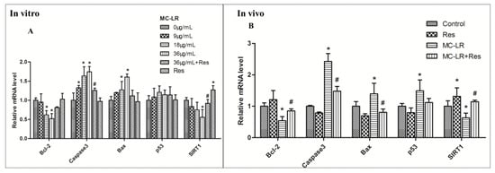 In order to examine whether MC-LR induced apoptosis through the SIRT1/p53 pathway, and evaluate the effect of RES on the target genes, the effects of MC-LR on the mRNA levels of the SIRT1/p53 pathway markers were tested. The co-culture of Sertoli–germ cells exposed to MC-LR (9, 18 and 36 μg/mL) with or without RES for 24 h and the mRNA expression of SIRT1, p53, Bcl-2, caspase-3 and Bax were tested in vitro by qPCR analysis. MC-LR exposure significantly increased mRNA expression for caspase-3 and Bax at 18 and 36 μg/mL in Figure 4A. A slight upregulation in p53 mRNA expression was found in the MC-LR group, but there was no significant difference, when compared to the control group. Furthermore, Bcl-2 and SIRT1 mRNA expression was downregulated after exposure to 36 μg/mL of MC-LR. In the presence of 20 μM of RES, the MC-LR-induced upregulation of caspase-3 and Bax was blunted. The suppression of Bcl-2 and SIRT1 mRNA expression by MC-LR was rescued by RES pretreatment (Figure 4A). MC-LR exposure in vivo induced the mRNA expression of p53, Bax and caspase-3 to increase in testicular tissues (Figure 4B). Conversely, SIRT1 and Bcl-2 mRNA expression was decreased by MC-LR treatment. Compared to the MC-LR group, RES pretreatment suppressed the MC-LR-induced p53, Bax, and caspase-3 mRNA expression, and increased SIRT1 and Bcl-2 mRNA levels, which was similar to the untreated group (Figure 4B). Taken together, these results indicate that RES could protect against MC-LR-induced germ cell apoptosis through the SIRT1/p53 pathway.