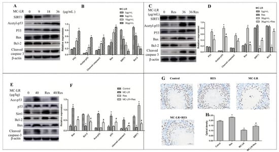 Apoptosis-related protein expression levels in co-cultured Sertoli–germ cells and testicular tissues exposed to MC-LR in the presence or absence of RES. (A–D) Western blot of sirtuin 1 (SIRT1), p53, acetylated p53, Bax, Bcl-2, and cleaved caspase-3 in co-cultured Sertoli–germ cells exposed to MC-LR in the presence or absence of RES; and (E,F) Western blot of apoptosis-related protein expression levels in testicular tissues of rats exposed to MC-LR with or without RES. The expression levels were quantified with Quantity One. β-actin was used as a loading control. Data are presented as mean ± SEM for each group; * p < 0.05 vs. the control group, # p < 0.05 vs. the MC-LR group (in vitro: 36 μg/mL; in vivo: 40 μg/kg). (G) Immunohistochemistry was used to examine the effect of MC-LR and RES on SIRT1 protein expression in rat testes (×400). Scale bar: 50 μm. (H) The quantitative analysis of SIRT1 expressed in each of the groups, * p < 0.05 vs. the control group, # p < 0.05 vs. the MC-LR group (40 μg/kg).