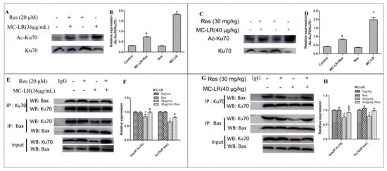 The western blot of acetylated Ku70 protein levels and the immunoprecipitation analysis of the Ku70–Bax binding state in co-cultures of Sertoli–germ cells and testicular tissues. (A,B) The western blot of acetylated Ku70 in co-cultures of Sertoli–germ cells after treatment with MC-LR with or without RES; (C,D) The western blot of acetylated Ku70 in the testicular tissues of rats exposed to MC-LR with or without RES; (E,F) The change in Ku70–Bax binding state in co-cultured Sertoli–germ cells exposed to MC-LR with or without RES by immunoprecipitation analysis; (G,H) The change in Ku70–Bax binding state in testicular tissues of rats exposed to MC-LR with or without RES by immunoprecipitation analysis. The band intensities of the immunoblots were quantified using Quantity One software, and are statistically presented in graphs. Data are presented as mean ± SEM for each group; * p < 0.05 vs. the control group, # p < 0.05 vs. the MC-LR group (in vitro: 36 μg/mL; in vivo: 40 μg/kg).