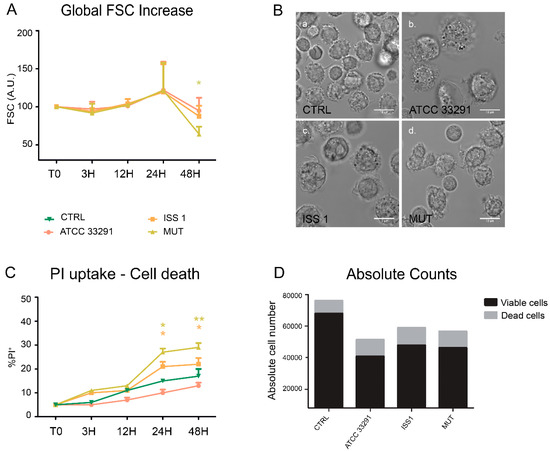 Morphological features and cell death rate. (A) Trends of forward light scatter (FSC) values for each treatment during the time course from the start (T0) to 48 h. The FSC values were converted to arbitrary units (A.U.), setting the control (T0) to 100. Each value is expressed as the mean ± SD (results from n ≥ 3 independent experiments). Two-way ANOVA with Bonferroni’s multiple comparison test revealed * p < 0.05 vs. control (T0); (B) Bright-field images of monocytes after 24 h of preincubation with Campylobacter jejuni ATCC 33291 lysate (b), C. jejuni ISS 1 lysate (c) and C. jejuni 11168H cdtA mutant lysate (d), compared to the untreated control cells (a). Bars: 10 µm; (C) Trends of percentage of propidium iodide (PI)-positive cells for each experimental condition during the time course from T0 to 48 h. Each value is expressed as the mean ± SD (results from n ≥ 3 independent experiments); * p < 0.05 and ** p < 0.01 vs. control (T0); (D) Absolute counts of viable and dead cells after 48 h of preincubation with the lysates, compared to untreated control cells. Results from a representative experiment.