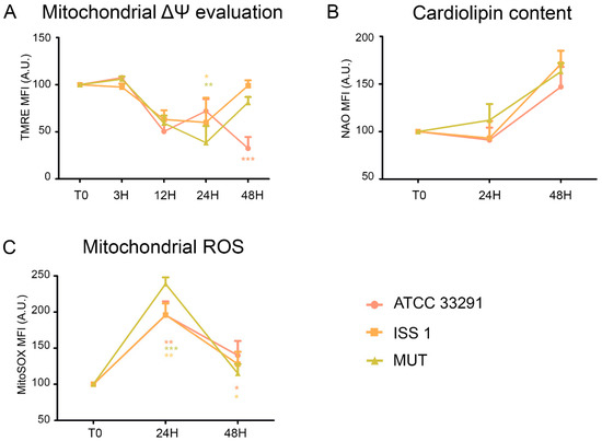 (A) Trends of TMRE mean fluorescence intensity (MFI) for each treatment during the time course from T0 to 48 h. Mean values were converted to A.U., setting the control (T0) to 100. Each value is expressed as the mean ± SD (results from n ≥ 3 independent experiments). Two-way ANOVA with Bonferroni’s multiple comparison test revealed: * p < 0.05, ** p < 0.001, and *** p < 0.001 vs. control (T0). The trend during the time course was determined to be significant. (B) Trends of nonyl acridine orange (NAO) MFI for each experimental condition during the time course from T0 to 48 h. The mean values were converted to A.U., setting the control (T0) to 100. Each value is expressed as the mean ± SD (results from n ≥ 3 independent experiments). (C) Trends of MitoSOX MFI for each treatment during the time course from T0 to 48 h. The mean values were converted to A.U., setting the control (T0) to 100. Each value is expressed as the mean ± SD (results from n ≥ 3 independent experiments) Two-way ANOVA with Bonferroni’s multiple comparison test revealed: * p < 0.05, ** p < 0.001, and *** p < 0.001 vs. control (T0).