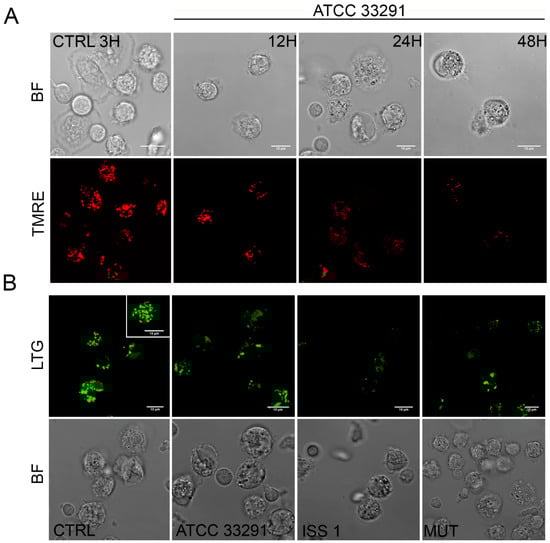 (A) Single confocal optical sections of TMRE (mitochondria), with the relative bright-field (BF) images, of CTRL cells and monocytes infected with C. jejuni ATCC 33291 lysates for 12, 24, and 48 h. Bars: 10 µm; (B) Single confocal optical sections of Lyso Tracker Green (LTG, lysosomes) with the relative BF images for CTRL cells and cells infected with ATCC 33291, ISS 1, and 11168H cdtA mutant lysates for 12 h. Bars: 10 µm.