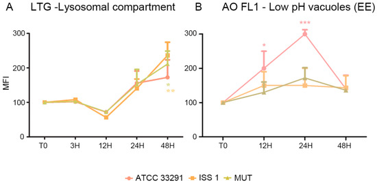 Figure 4 shows a comparison between the LTG-traced lysosomal network and AO FL1-traced vacuoles. For ATCC 33291 lysate-treated cells, it is evident an increase in low-PH vacuoles (endosomal compartment) concomitant to an increase in AVOs up to 24 h, whereas, at 48 h, the endosomes decreased, and AVOs reached a plateau level. In contrast, mutant and ISS 1 lysate–treated cells did not particularly increase their content in low-PH vacuoles, whereas the lysosomes peaked.