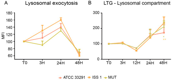 Being specialized phagocytic cells, monocytes typically express low levels of surface LAMP-1 (CD107a). In this study, the expression of surface LAMP-1 protein was investigated in infected and uninfected cells. It was observed an increase in LAMP-1 expression principally in monocytes preincubated with the wild-type lysates from T0 to 24 h (Figure 5A). Increasing the exposure time (48 h), a downregulation of LAMP-1 to hypo-physiologic levels occurred. Our data on lysosomal exocytosis suggested that lysosomes, in the first infection stages, may “dump” indigested materials, reducing their accumulation within lysosomes, whereas, at 48 h, a drop in exocytotic activity was registered. These findings were coupled with the LTG results (Figure 5B): in fact, the decrease in lysosomes size and number was not due to exocytosis activation. On the contrary, at 48 h, when LTG fluorescence peaked, LAMP-1 strongly decreased. This process might have an important role in secretion and plasma membrane repair, since the lysosomes play a key role in resealing the membrane to prevent cell death [34].