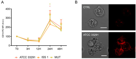 CD14 expression. (A) Graph showing CD14 expression in monocytes preincubated with the lysates. The mean values were converted to A.U., setting the control (T0) to 100. Each value is expressed as the mean ± SD (results from n ≥ 3 independent experiments). Two-way ANOVA with Bonferroni’s multiple comparison test revealed: * p < 0.05 vs. control (T0). The trend during the time course was determined to be significant; (B) Confocal images of CD14-PE with the relative BF images from monocyte control cells and monocytes preincubated with the C. jejuni ATCC 33291 lysate for 24 h. Bars: 10 µm.