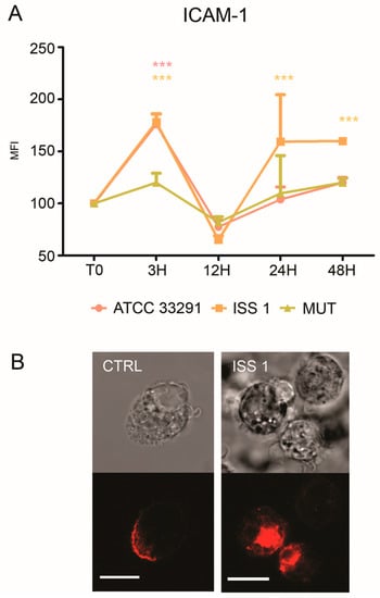 ICAM-1 expression. (A) Graph showing ICAM-1 expression. The mean values were converted to A.U., setting the control (T0) to 100. Each value was expressed as the mean ± SD (results from n ≥ 3 independent experiments). Two-way ANOVA with Bonferroni’s multiple comparison test revealed: *** p < 0.001 vs. control (T0). The trend during the time course was determined to be significant; (B) Confocal images of CD54-PE with the relative BF images from monocyte control cells and monocytes preincubated with the ISS 1 lysate after 48 h of treatment. Bars: 10 µm.