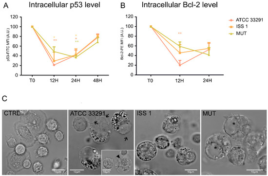 p53 and Bcl-2 protein levels and morphologic features of cell death. (A) Graphs showing p53 intracellular content for each experimental condition during the time course from T0 to 48 h. The mean values were converted to A.U., setting the control (T0) to 100. Each value is expressed as the mean ± SD (results from n ≥ 3 independent experiments). Two-way ANOVA with Bonferroni’s multiple comparison test revealed: * p < 0.05 and ** p < 0.01 vs. control (T0); (B) Graphs showing Bcl-2 intracellular content for each experimental condition during the time course from T0 to 48 h. The mean values were converted to A.U., setting the control (T0) to 100. Each value is expressed as the mean ± SD (results from n ≥ 3 independent experiments). Two-way ANOVA with Bonferroni’s multiple comparison test revealed: ** p < 0.01 vs. control (T0); (C) BF images of monocytes after 24 h of preincubation with C. jejuni ATCC 33291, ISS 1, and 11168H cdtA mutant lysates, compared to untreated control cells (CTRL). In infected cells, it is possible to appreciate apoptotic blebs (black arrows), condensed nuclei (arrowhead), cytoplasmic vacuoles (asterisks), and a diffuse granulation (in particular in ATCC 33291 and ISS 1). Bars: 10 µm.