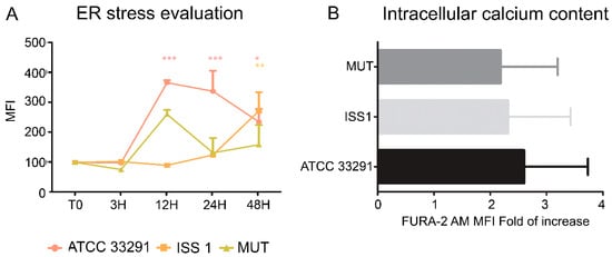 ER stress might be both a trigger and consequence of chronic inflammation. Monocytes were stained with ER-Tracker Green and Fura-2 AM in order to investigate ER stress and intracellular Ca2+ level perturbations. ER-Tracker Green dye is a cell-permeant, live-cell stain that is highly selective for the ER. It stains ER membranes and it is known to be an ER stress marker in both cytometry and microscopy [62]. Our data showed that ER stress occurred after 12–24 h of treatment (Figure 9A), especially in monocytes infected with the C. jejuni ATCC 33291 lysate. Moreover, the lysate from the cdtA mutant strain caused more ER modifications then the that from the ISS 1 wild-type strain; we supposed that ER stress was not an effect associated with CDT, but it was due to other C. jejuni virulence factors. In addition, the FURA-2 AM results showed an increase in intracellular Ca2+ content in monocytes preincubated for 48 h with the C. jejuni ATCC 33291 lysate compared with other experimental conditions (data not statistically significant) (Figure 9B).
