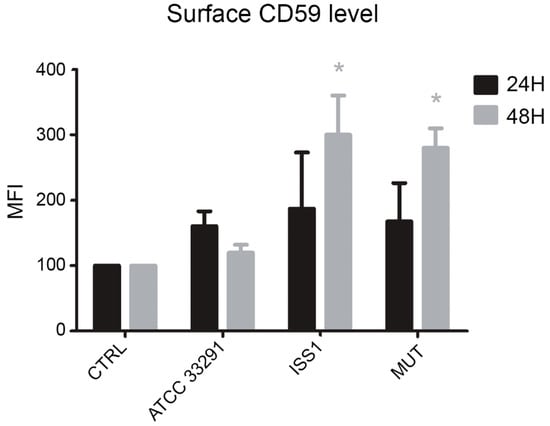 CD59 expression was studied in monocytes in order to investigate if the MAC complex was involved in the cell response triggered by C. jejuni lysates. It was found that, from 24 to 48 h, in infected monocytes, upregulation of CD59 surface expression occurred: it was particularly evident in cells preincubated with the C. jejuni ISS 1 lysate, followed by monocytes preincubated with the mutant strain lysate (Figure 10). This condition, being CD59 a critical complement regulator in protecting human cells from MAC formation and MAC-induced phenomena, seems to predispose the monocytes to survive. In fact, it is known that CD59 overexpression may assist malignant cells to escape immunologic surveillance and complement-mediated cytolysis [61].