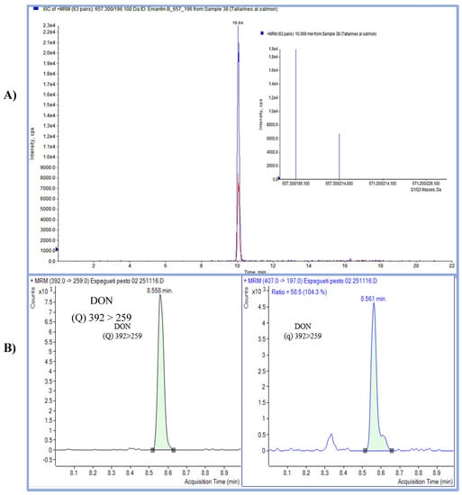 - Beltrán, E.; Ibáñez, M.; Portolés, T.; Ripollés, C.; Sancho, J.V.; Yusà, V.; Marin, S.; Hernández, F. Development of sensitive and rapid analytical methodology for food analysis of 18 mycotoxins included in a total diet study. Anal. Chim. Acta 2013, 783, 39–48. [Google Scholar] [CrossRef] [PubMed]