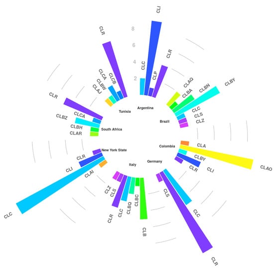 New genotypes comprising GTAR, GTBZ, and GTCA were observed for South African and Tunisian strains (Table 1). For all the other countries, at maximum new variants of existing genotypes were detected. They included GTIV, GTIVI (Argentina), GTAQI, GTBNI, GTBNII, GTBYI (Brazil), GTAOI, GTAOII (Colombia), GTRXIII (Italy), GTCV and GTIV (New York State). For each country, a specific genotypic pattern was found. Major genotypes with their variants were combined into genotypic clusters (CL) [14] and showed in Figure 1. For Argentina (Table 1, Figure 1) it mainly consisted of CLI (56% of GTI variants) and CLR (25% of GTR variants), whereas for Brazil CLBN (20% of GTBN plus variants) and CLBY (40% of GTBY plus a variants) were most prominent. The Colombian strains were mainly positive for GTAO and its variants (CLAO, 60%). In the case of Germany and Italy, the most prevalent genotypes were GTCI, GTR plus variants, and GTB, combined into CLC (30%), CLR (64.7%) and CLB (29.4%), respectively. Finally, the main genotypes observed for the South African and Tunisian strains were GTR and its variants (CLR, 45%), whereas the American strains were mainly positive for GTC and variants of it (CLC, 70.6%). In conclusion, cluster C was observed mostly in Germany and New York State, while CLR was widely disseminated in seven countries; especially it was frequently detected in Argentina, Germany, Italy, South Africa and Tunisia but less in Colombia and New York State.