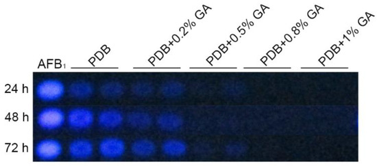 A sample of 107 spores was inoculated into 30 mL PDB with different concentration (0, 0.2%, 0.5%, 0.8%, 1%, w/v) of GA, cultured at 30 °C, 200 rpm. Next, 200 µL culture medium were taken out at 24 h, 48 h, and 72 h, respectively, for TLC analysis, AFB1: Aflatoxin B1 standard from Sigma. These were 0.2% GA: 0.2% (w/v) GA, 0.5% GA: 0.5% (w/v) GA, 0.8% GA: 0.8% (w/v) GA, 1% GA: 1% (w/v) GA. w/v: Weight/volume, such as 0.3 g GA add into 30 mL PDB medium will make a PDB+1% (w/v) GA.
