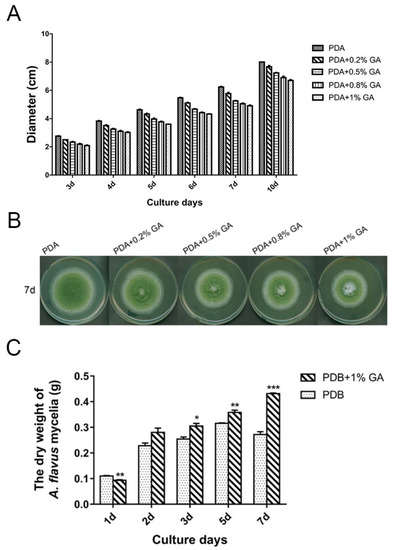 GA affects A. flavus growth. (A) 103 spores were inoculated on PDA medium with different concentrations (w/v) of GA and cultured at 30 °C, the diameters were measured on different culture days. (B) The photo of the samples on the 7th day cultivation. (C) 107 spores were inoculated into 30 mL PDB with or without 1% (w/v) GA and cultured at 200 rpm, 30 °C for different days, then the mycelia were collected and measured. Each treatment has three replicates, *: p < 0.05, **: p < 0.01, ***: p < 0.001.