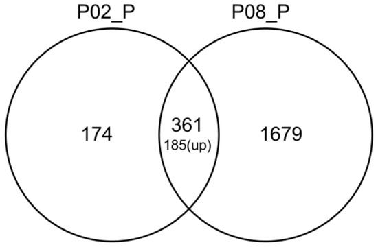 Venn diagram of the significantly differentially expressed genes. In total, 361 genes were shared in these two sets, of which 185 were upregulated. P02_P: Significantly differentially expressed genes between 0.2% (w/v) gallic acid-treated and untreated A. flavus samples. P08_P: Significantly differentially expressed genes between 0.8% (w/v) gallic acid-treated and untreated A. flavus samples.