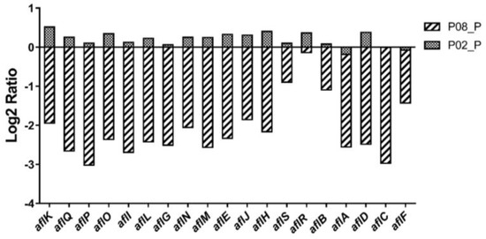 Effect of GA on the expression of the aflatoxin assigned genes in A. flavus. P: Untreated A. flavus samples, P02: 0.2% (w/v) GA treated A. flavus samples, P08: 0.8% (w/v) GA treated A. flavus samples. P02_P Ratio: The mean value of the count number of each gene in P02/in P. P08_P Ratio: The mean value of the count number of each gene in P08/in P.