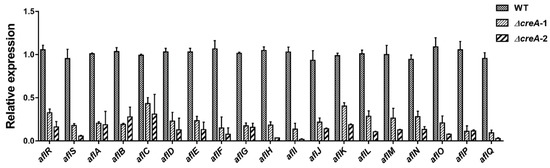 Expression ratios of the aflatoxin biosynthesis-assigned genes in the ∆creA mutants compared to wild type WT(TJW149.27). A total of 107 spores of WT, ∆creA-1, and ∆creA-2 were inoculated into 30 mL PDB medium, and cultured at 200 rpm, 30 °C for 3 days, the mycelia was collected for RNA extraction, then the RNA was reverse transcript into cDNA for qRT-PCR analysis. The primers for the qRT-PCR can be found in Table S7. The expression of each gene in the WT was normalized as 1.0, each sample has three replicates, and the error bars indicate the standard error of the mean.